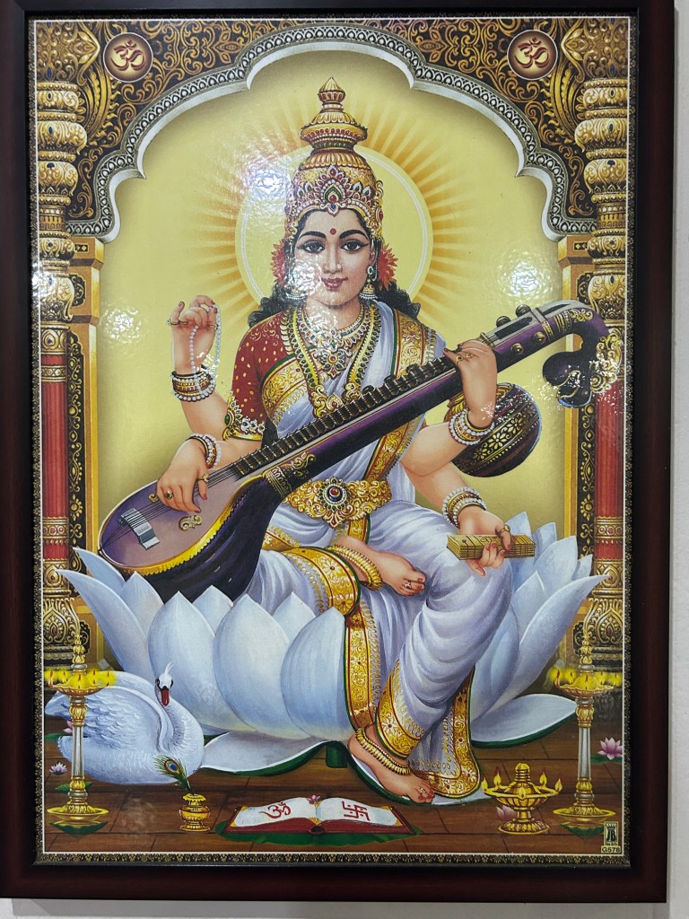 Sarasvati brukar betecknas som lärandets, kunskapens och talets gudinna, liksom konstens och musikens beskyddarinna. Hon är en av de många aspekterna av Maha Devi, den stora modern som födde Brahma, Vishnu och Ṣiva som är de tre främsta gestalterna inom hinduismen bredvid gudinnorna.