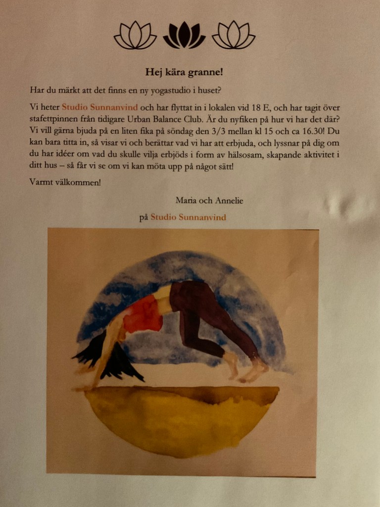 För dig som ännu inte hittat till Studio Sunnanvind tänkte vi ha ett nytt öppet hus så att du kan komma hit och se hur vi har det, ta en fika och prata om vad du skulle önska för aktiviteter i studion. Samtalsgrupp om drömmar? Meditationsgrupp? Måla, skriva, tyst retreaters, syjunta…? Vi har en underbar lokal som vi vill använda! Så titta in! Du kan prova på lite yoga, dricka lite te och kolla in vår lokal! Dörren är öppen från kl 14 till kl 17!